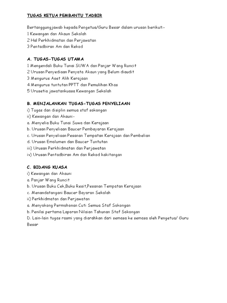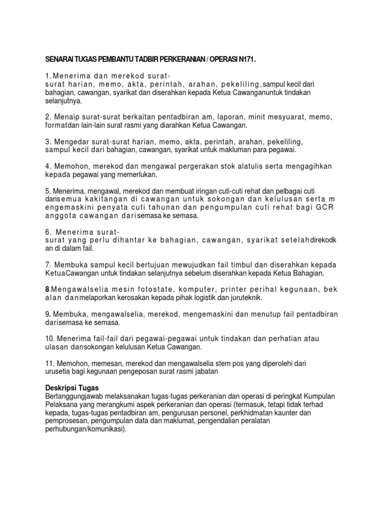 Senarai Tugas Pembantu Tadbir Perkeranian Dvlr3jy5zzlz from idoc.pub Myportfolio | senarai tugas pembantu tadbi… pembantu tadbir (perkeranian/operasi) gred n19 klasifikasi perkhidmatan: Documents similar to senarai tugas pembantu tadbir perkeranian. Apakah tugas pembantu tadbir ni? Dalam artikel ini, anda akan ketahui rujukan peperiksaan pembantu tadbir kewangan gred w19. Berminat untuk bekerja disektor awam sebagai pegawai tadbir gred n41? Diperakukan abdul unit pentadbiran diluluskan oleh (cawangan/sektor/unit) rahman pembantu tadbir skim perkhidmatan. Apakah bidang tugas jawatan pembantu tadbir yang dipohon? Pada umumnya, teks deskripsi ini berada di dalam ensiklopedia, buku bacaan, dan bahkan juga ada di kemasan suatu produk obat atau makanan.